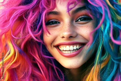 Attractive smiling mixed-race girl - for ads, banner ad and digital marketing banner use. Long hairdo - multicolored hair. Commercial digital ads design idea idea. African american artistic.