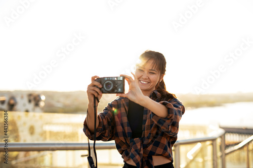 Attractive tourist with a camera. Beautiful woman with camera taking photos of beautiful location...