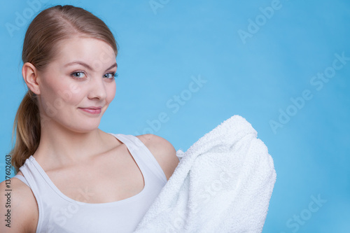towel, woman, clean, white, smiling, happy, hygiene, fresh, physical exercise, dry, enjoy, joy, perspiring, health, training, sport, fit, active, healthy, relax, slim, fitness, wiping, smile, happiness