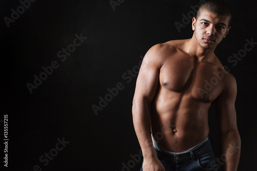 male, poster, studio, shirtless, isolated, portrait, clothing, training, energy, posing, muscular, image, determined, sport, gym, fitness, physical exercise, weightlifter, power, african, bodybuilder, healthy, black, man, looking, strong, dark, skin, skinned, standing, background, photogenic, attractive