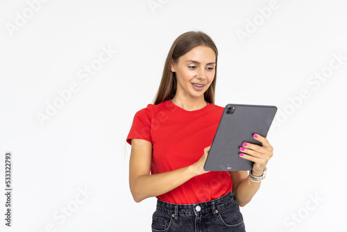 Attractive young businesswoman in glasses standing and using tablet over white background
