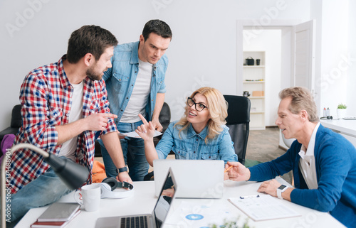 Attractive young woman pointing at her colleague