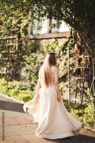 Attractive young woman with long dress enjoying her time outside in park sunset background