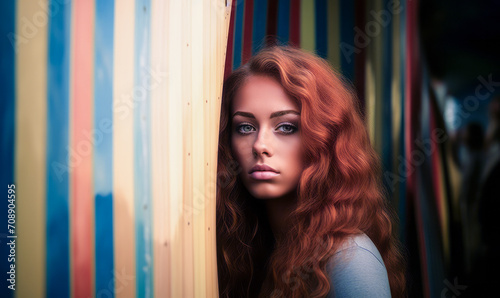 Auburn-haired beauty with a captivating gaze, partially concealed by a vibrant surfboard, evoking a sense of mystery and adventure