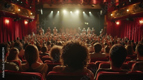 audience, theatre, performance, stage, applause, cheering, applause, spotlight, red, curtain, show, enjoyment, entertainment, live, music, concert, play, musical, drama, actor, actress, singer, dancer, musician, crowd, packed, house, front, row, back, seat, dark, room, lit, light, excited, happy, enthusiastic, celebrate, singing, dancing, acting, dramatic, performing, art, cultural, event, night time