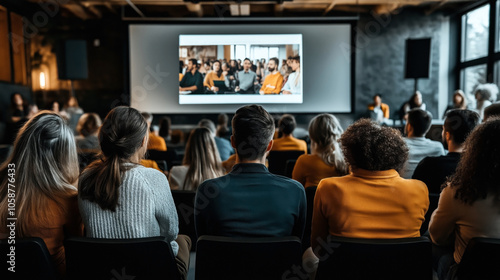 Audience attending a presentation in a dimly lit conference room with a large screen showing a video of a diverse group of people engaging in a discussion.