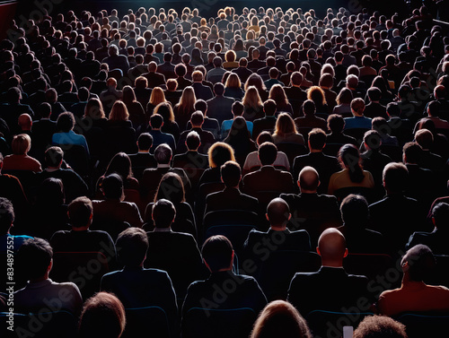 Audience seated in a theater looking towards a stage, dark and black predominant, capturing the concept of a crowd at an event. Generative AI