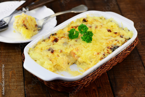 casserole, gratin, potato, vegetable, cheese, dish, main course, potato, food, meal, herb, rosemary, carrot, carrot, carrot, carrot, herb, crust, plate, shell, fork, flatware, cream, parsley, pepper, vegetarian, vegan