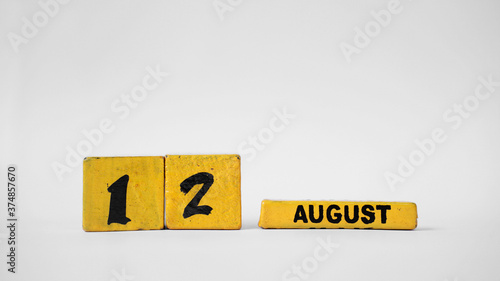 AUGUST 12 Wooden calendar. International Youth Day. White background with space for your text