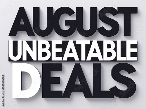 august, deal, unbeatable, sale, month, text, lettering, typography, word, promotion, announcement, discount, offer, savings, bargain, special, event, advertising, marketing, retail, shopping, online, summer, season, calendar, time, date, present, reduced, price, value, shop, consumer, purchase, buy, opportunity, message, communicate, information, display, design, white, black, shadow, block, bold, upper case letter, graphic