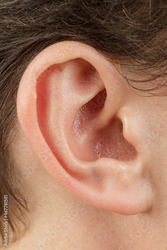 auricle close-up, outer ear, human anatomy hearing aid, ear canal, tragus and antitumor, lobe, selective focus