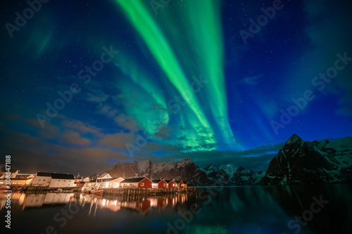 Aurora borealis on the Lofoten islands, Norway. Green northern lights above mountains. Night sky with polar lights. Night winter landscape