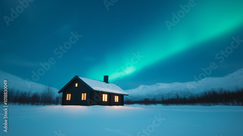 Aurora Borealis over an Arctic cabin with twinkling snowflakes, a stunning winter tour experience in Lapland