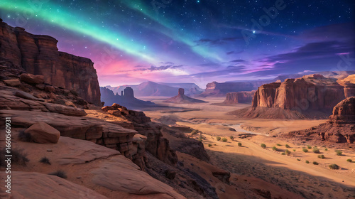 Aurora borealis paints the sky above a breathtaking desert canyon