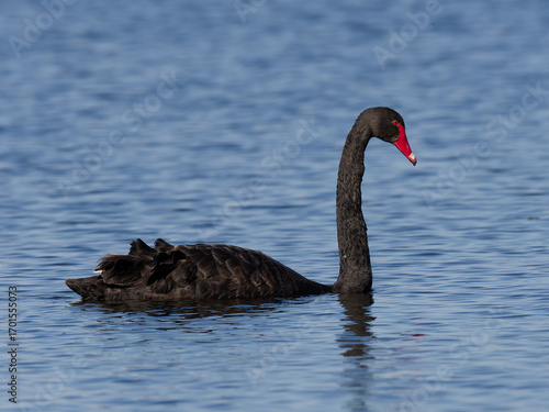 Australian Black Swan (Cygnus atratus) swimming in a lake.