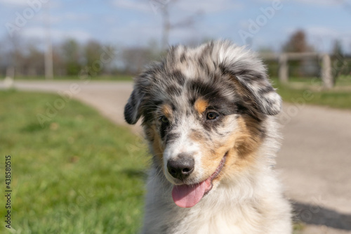 Australian Shepherd Dog puppy head, The tricolor dog has tongue sticking out of its mouth. Seen from the front