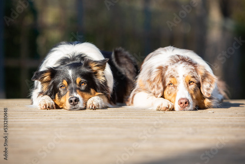 australian shepherd dogs in the park in spring