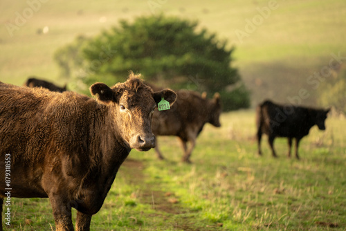 Australian wagyu cows grazing in a field on pasture. close up of a black angus cow eating grass in a paddock in springtime in australia and new zealand