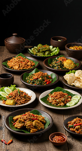 Authentic assortment of delicious Indonesian cuisine, including sambal and krupuk, presented traditionally on a dark wooden background.