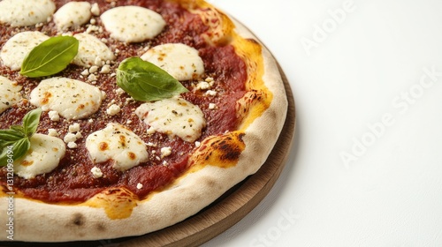 Authentic classic margherita pizza topped with fresh mozzarella and basil on a wooden table