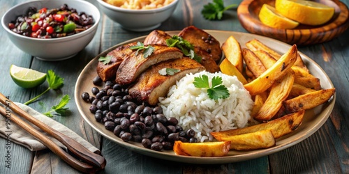 Authentic Cuban food, including slow-roasted pork, black beans and rice, plantains, and yuca fries, Cuban