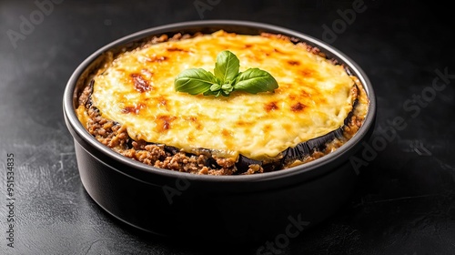 Authentic Greek moussaka dish with layered eggplant, ground meat, and bechamel, baked to golden perfection, Mediterranean cuisine