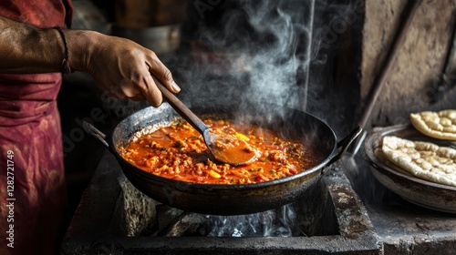 food, cooking, chef, indian, cookery, spicey, curry, sauce, tomatoes, meat, vegetable, pan, wok, wooden, spoon, steam, hot, delicious, favor, eatery, kitchen, preparation, culinary, receipe, ingredient, traditional, culture, heritage, authentic, bread, fire, heat, appetising, tasty, gastronomy, meal, dinner, lunch, plate