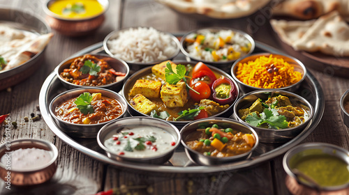 Authentic Indian Thali with Assorted Curries, Rice, Naan, and Traditional Accompaniments