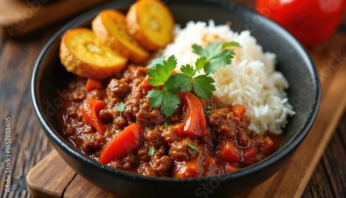 bell pepper, rice, caribbean, cookery, latin, american, food, traditional, dish, authentic, receipe, savoury, meal, plate, rustic, kitchen, culinary, delight, flavorful, tropical, dining, comfort, hearty, dinner, lunch, cooking, cookery, preparation, ingredient, epicure, photo, eatery, cafes, eatery, kitchen utensile, table, wooden, parsley, garnish, fresh, herb, vegetable, meat, beef