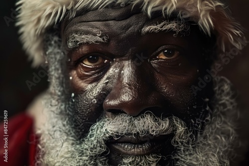 santa, claus, christmas, portrait, man, senior, black, african, american, real, authentic, beard, costume, red, hat, looking, serious, expression, face, close, up, winter, holiday, season, december, tradition, festive, celebration, magic, joy, gift, giving, hope, wonder, childhood, memory, father, grandfather, wisdom, life events, kind, gentle, loving, caring, magical, north, pole, workshop, elf