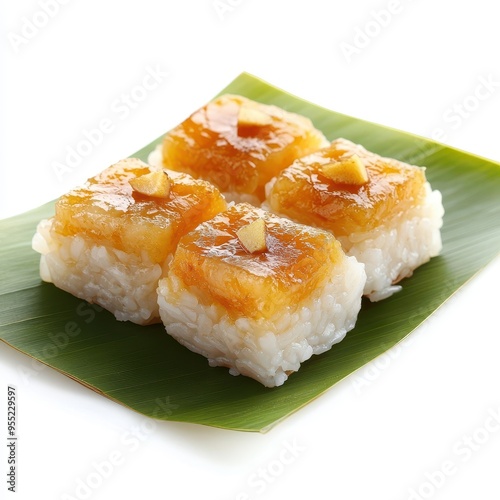 Authentic Thai Dessert of Sweet Sticky Rice with Banana on Banana Leaf - Close-up Food Photography on White Background