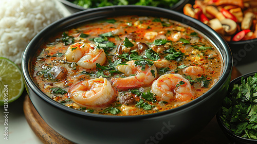 Authentic Thai Tom Yum soup with shrimp, coconut milk, lime, chilies, mushrooms, and herbs, accompanied by rice and side dishes, served elegantly on a white table, ideal for Asian cuisine or spicy foo