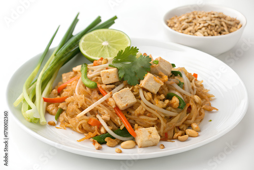 Authentic vegetarian Pad Thai with rice noodles, tofu, and vegetables, representing Thai street food culture and healthy plant-based cuisine.