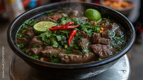 Authentic Vietnamese Pho Bowl with Beef, Fresh Herbs, Lime, and Red Chili Peppers in a Rustic Setting - Rich, Fragrant, Delicious, Vietnamese Cuisine Delight
