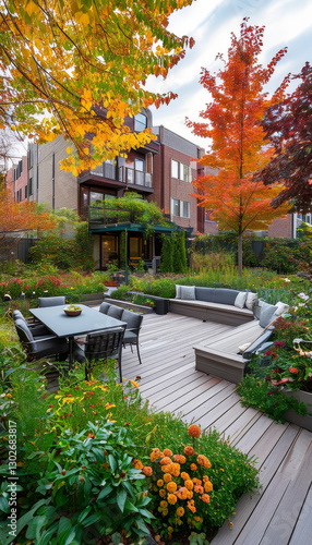 autmun, urban neighbourhood landscaping, Modern Urban House, wide shots of home gardens, lawns, yards, decks and spaces for outdoor entertaining, garden design, modern architecture concept