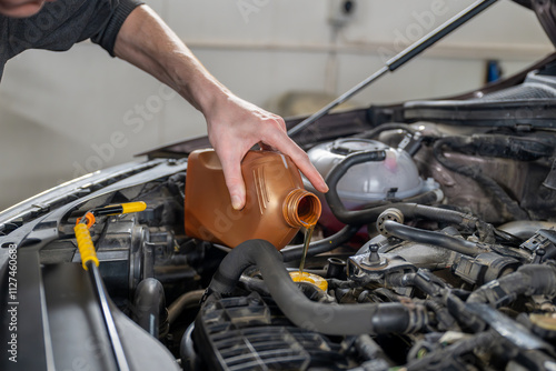 Auto mechanic pouring oil into a car engine in a car repair shop
