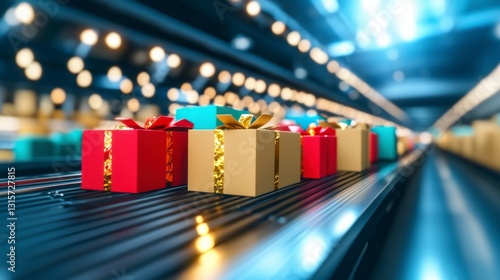 e-business, delivery, automation, conveyer belt, gift, present, package, box, cardboard, online shopping, retail, logistic, warehouse, factory, industry, technology, modern, efficient, fast, speed, transportation, distribution, process, system, production, merchandise, shipment, holiday, celebration, festive