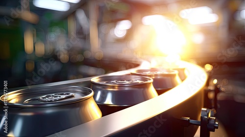 Automated Line: Sleek, metallic cans glide along an automated production line, bathed in the soft glow of the factory lights, exemplifying efficiency and industrial progress.