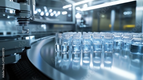 automation, production, line, ampoule, bottle, glasses, liquid, manufacturing, factory, industrial, technology, medicine, pharmaceutical, science, laboratory, research, equipment, machinery, robotic, arm, conveyer, belt, sterile, clean, modern, future, innovation, progress