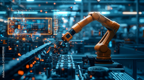 robot, arm, manufacturing, factory, automation, technology, industrial, machine, production, assembly, equipment, modern, digital, tech, system, orange, blue, bright, light, graphic, interface, datum, circuit, electronic, work, process, industry, panel, detail, closeup, robotic, engineering, future, computer, display, high technology, line
