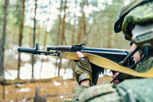 Automatic weapons in the hands of a soldier of the Russian army during a combat operation, against a background of coniferous forest and field