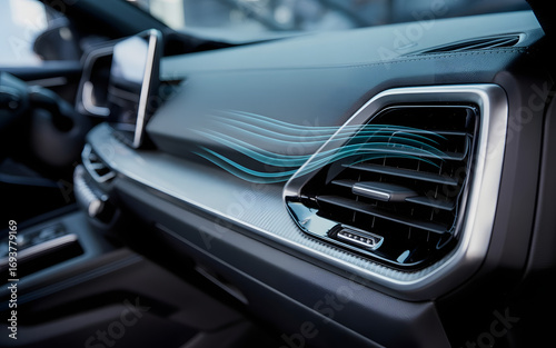 Automobile Interior Design: A detailed view inside a modern automobile's interior reveals the dashboard, air vents and metallic trim, illustrating design and functionality