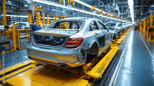 car, assembly, line, factory, manufacturing, production, automotive, industry, vehicle, plant, robot, machinery, technology, automation, conveyer, belt, metal, chassis, body, silver, grey, modern, industrial, process, engineering, transport, mechanic, men at work, blue, uniform, background, interior, exterior, part, component, system, workflow, efficiency, quality