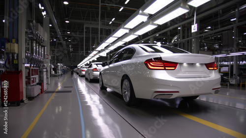Automobile manufacturing. Production line. Cars on assembly line. Highlighting tires, light details and glossy paint job.