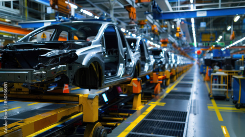 Automotive assembly line. Automobile factory. Car service industry. Modern technology vehicle manufacturing. Robotic machinery automated production. Industrial engineering automation control.