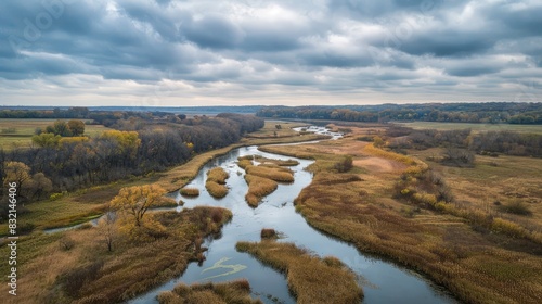 Autumn aerial view of river valley with reeds on riverbanks under a cloudy sky