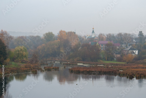 Autumn atmosphere. Yellow trees in the fog on the shore of an autumn lake.