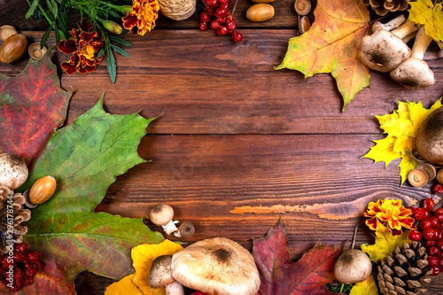 Autumn background of yellow and colored leaves, cones and nuts. place for text.