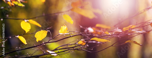 Autumn background with yellow autumn leaves on tree branches in autumn forest on a sunny day