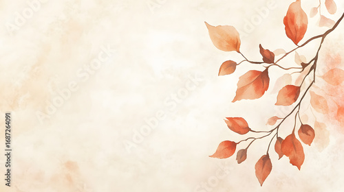 Autumn Branch with Watercolor, and Beige Background.